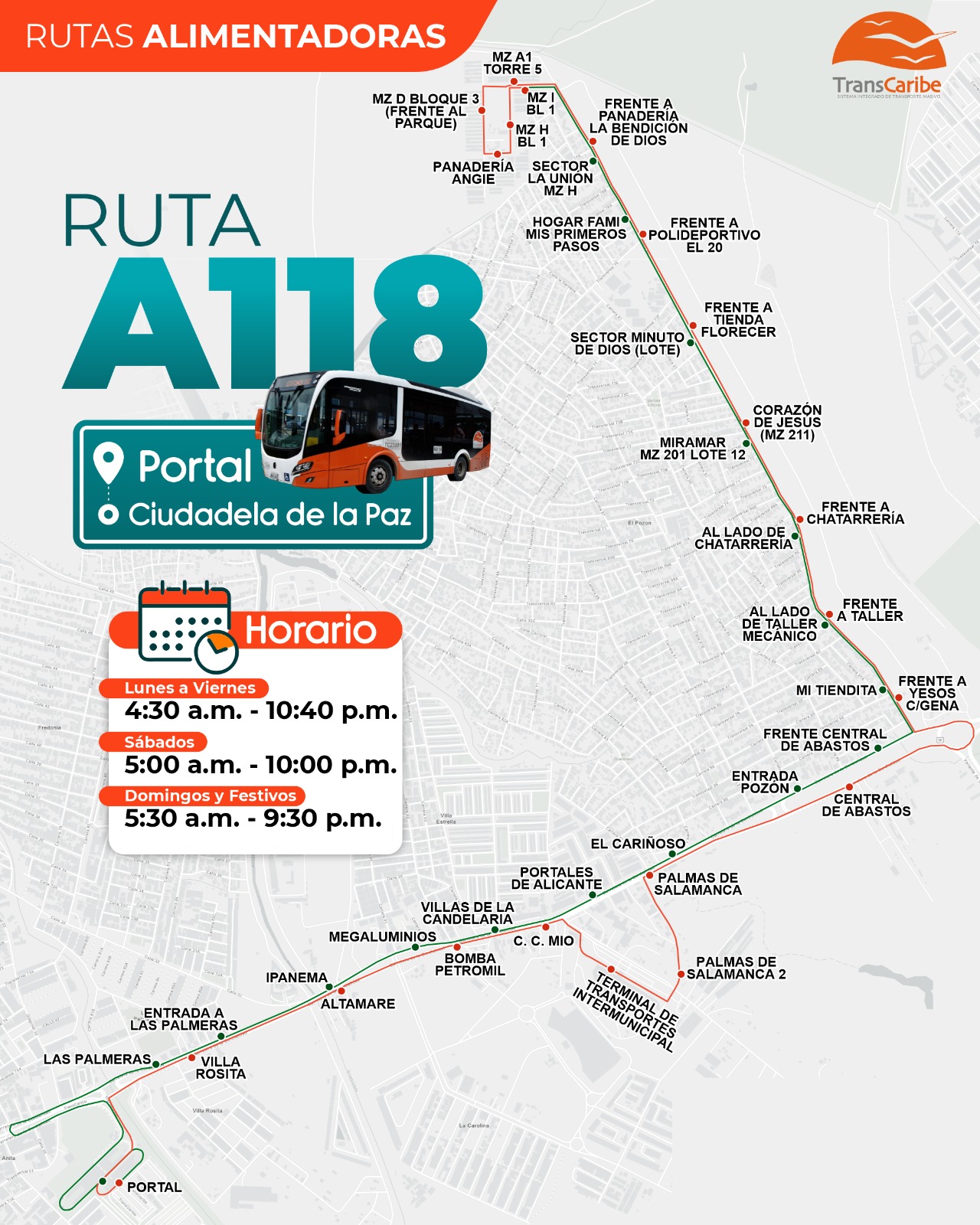 La Ruta A118 Portal – Ciudadela de la Paz es la tercera nueva ruta que implementa TransCaribe durante la administración del alcalde Dumek Turbay Paz, tras la puesta en operación de las rutas C017 Bodeguita – Zona Norte y C018 Bodeguita – Torices, a las cuales se suman la extensión de la ruta X106 hasta la Gobernación de Bolívar en Turbaco en franjas pico.